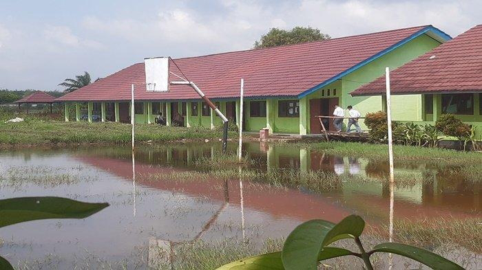 Situasi di SMKN 1 Pemulutan, Ogan Ilir, yang masih digenangi air sisa banjir, Senin (26/2/2024). (Sumber : tribunsumsel.com)